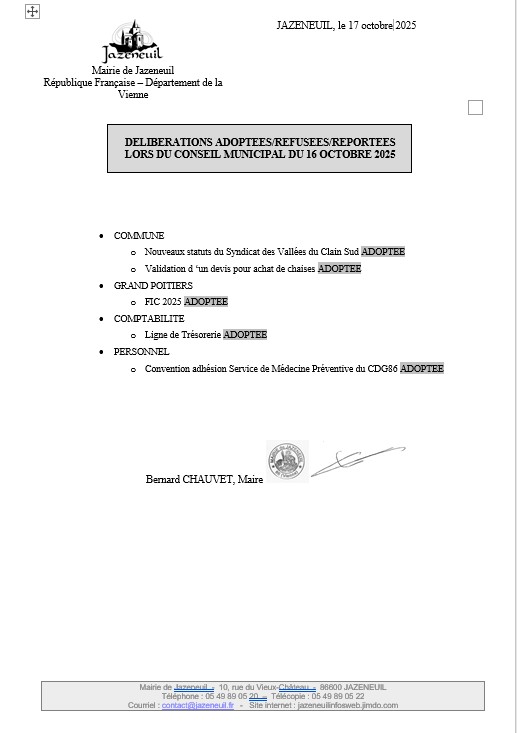 Délibérations adoptées ou refusées lors du CM du 5 octobre